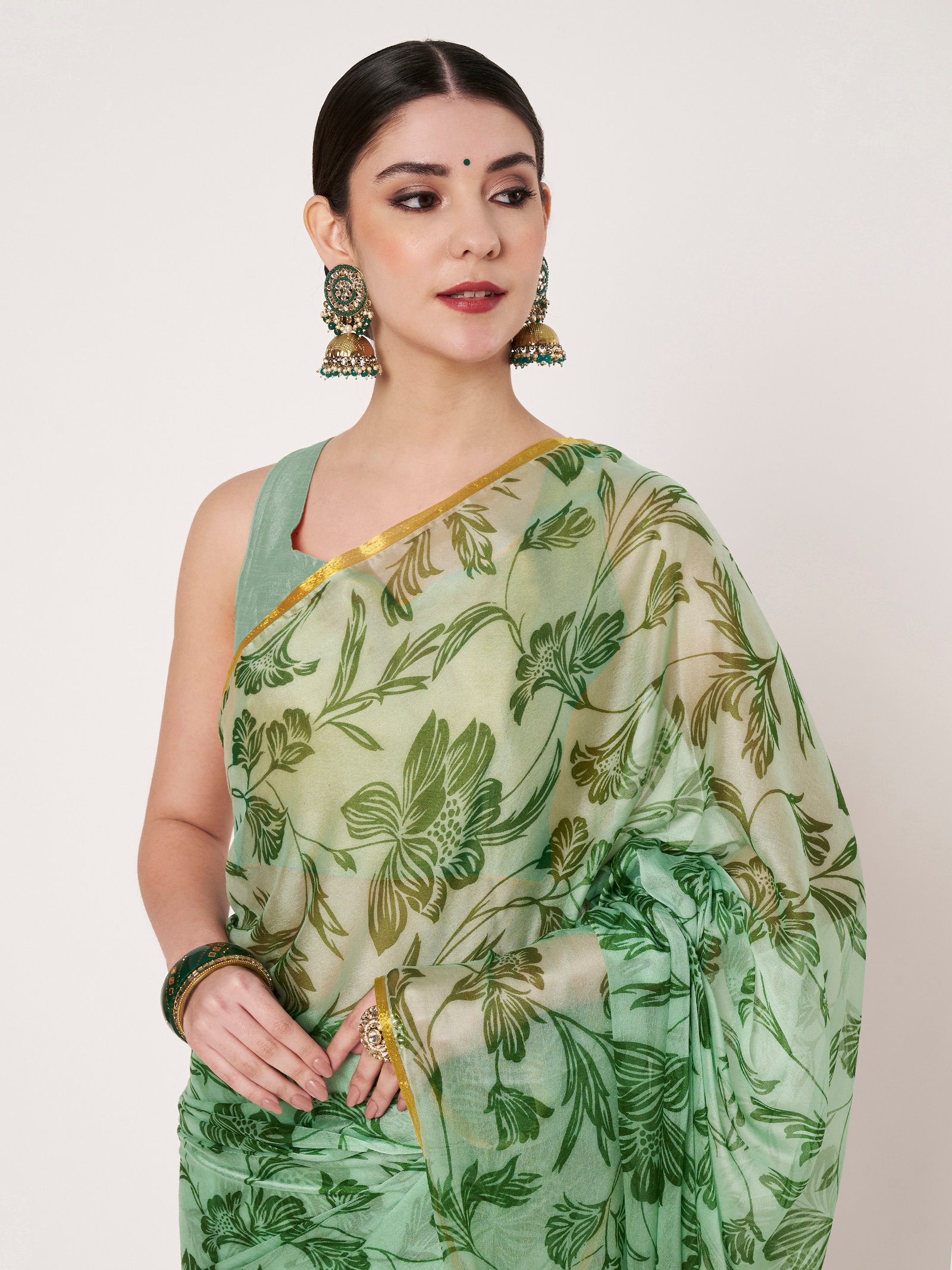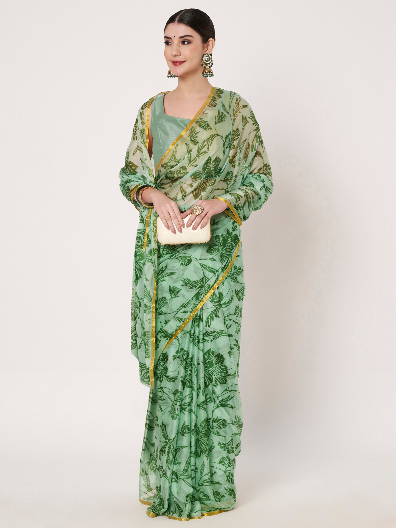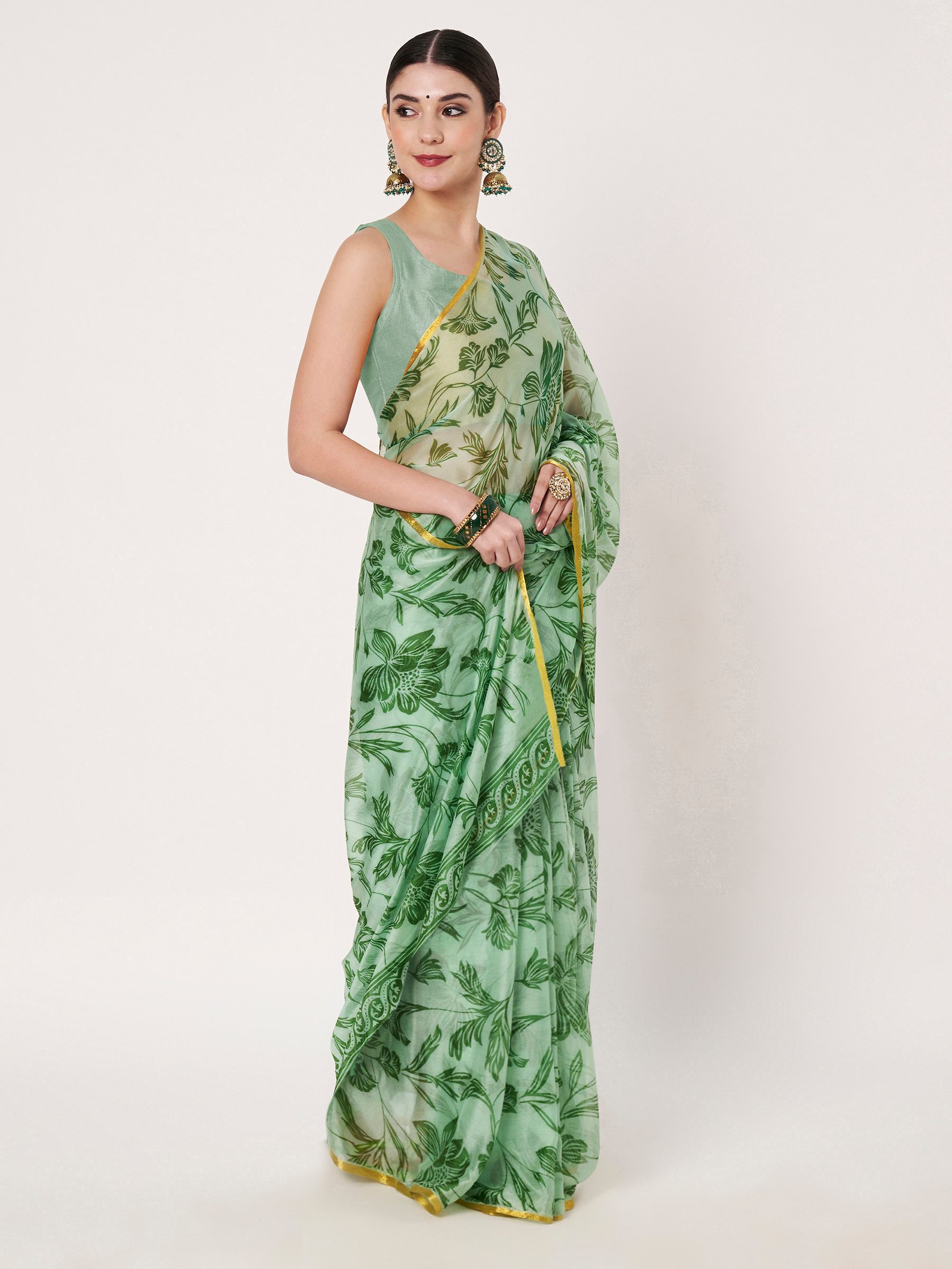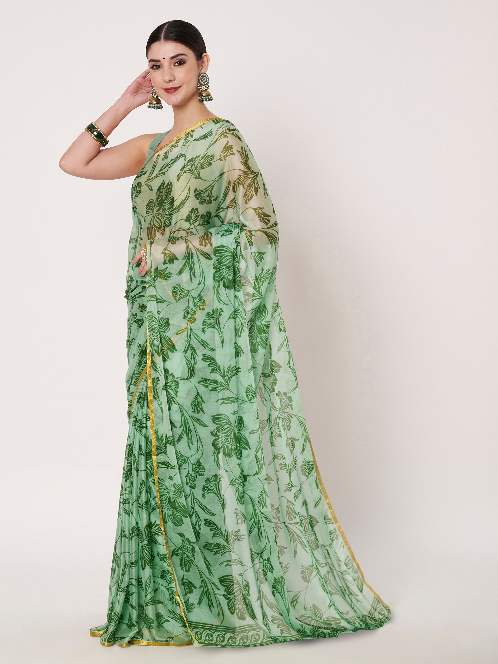 Green Chinon Saree, thoughtfully crafted to combine comfort with sophistication. Made from premium Chinon fabric, this saree is soft, lightweight, and breathable, ensuring effortless draping and graceful flow throughout the day. The delicate floral print enhances its feminine appeal, while the subtle zari piping along the borders adds a refined shimmer that elevates the overall look.